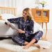 Elevate your sleepwear with this 100% Mulberry silk pajama set in elegant navy blue with ivory floral print. Crafted from 22 Momme pure silk, it feels luxuriously soft, breathable, and gentle on skin. Featuring a classic button-up top and elastic-waist pants, this silk sleepwear set offers timeless comfort and refined style for relaxing nights or leisurely mornings. Perfect as a luxury gift for her or a sophisticated silk loungewear essential.